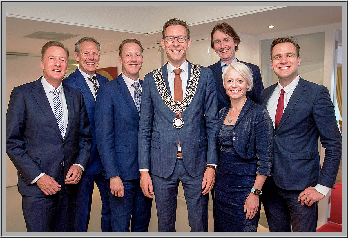 De leden van het College B en W van Amstelveen vlnr: wethouder Marijn van Ballegooijen (PvdA), wethouder Adam Elzakalai (VVD), wethouder Floor Gordon (D66), wethouder Frank Berkhout (D66), Tjapko Poppens burgemeester, Bert Winthorst gemeentesecretaris en wethouder Herbert Raat (VVD)