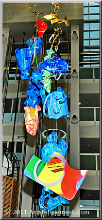 Naast het sculpturale werk, dat eerst vooral “staat” en “ligt” is er de laatste jaren een artistieke ontwikkeling geweest naar werk dat “hangt”. In vele vormen. Bijvoorbeeld multimedia hangobjecten, zoals volstrekt eigenwijze grote en kleine assemblages met vernuftig verweven combinaties van hout, glas, touw, metaal en wat je er nog meer functioneel artistiek bij kunt bedenken. Daarnaast reliëfs van veelkleurig kunststof in expressieve fauvistentaal. Op de tentoonstelling bij de SVB kunt u het allemaal zien. De expositie biedt een geslaagd overzicht van het oeuvre, waarbij zowel eerder als meer recent werk aan bod komen.