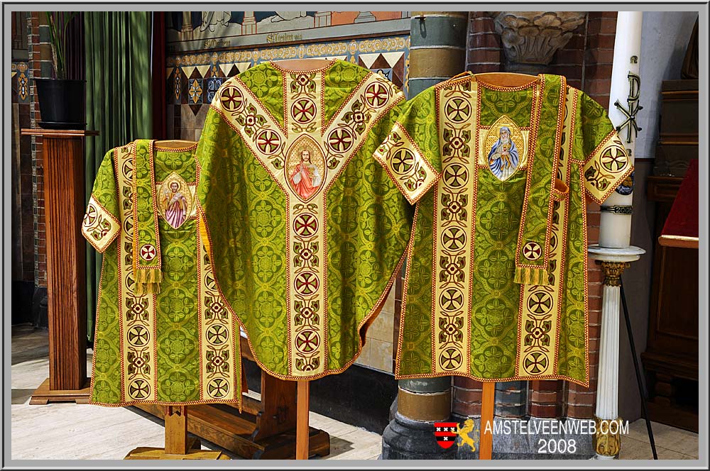 Een kazuifel is een mouwloos opperkleed, dat gedragen wordt door de priester als hij de mis opdraagt. Oorsprong: Latijnse woord casula, dat huisje betekent . Deze worden gedragen als door 'drie heren' de mis wordt opgedragen. Dit driestel heeft afbeeldingen van Christus, Maria en Jozef.