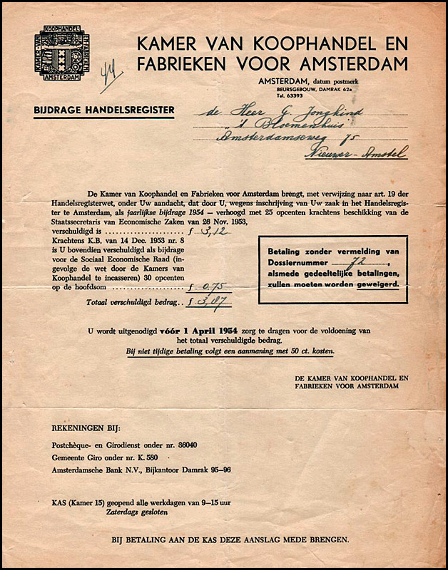 Bericht uit 1954 van de KvK aan de heer G. Jongkind vanwege een verhoging van de jaarlijkse bijdrage