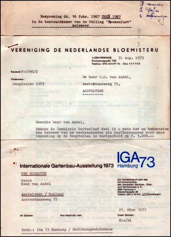 Bericht van de Vereniging De Nederlandse Bloemisterij met vermelding van het honoratium aan de heer van Andel voor zijn werkzaamheden als Hoofdarrangeur voor de bijdrage van de Vereniging aan de Hauptschau in 1973 te Hamburg
