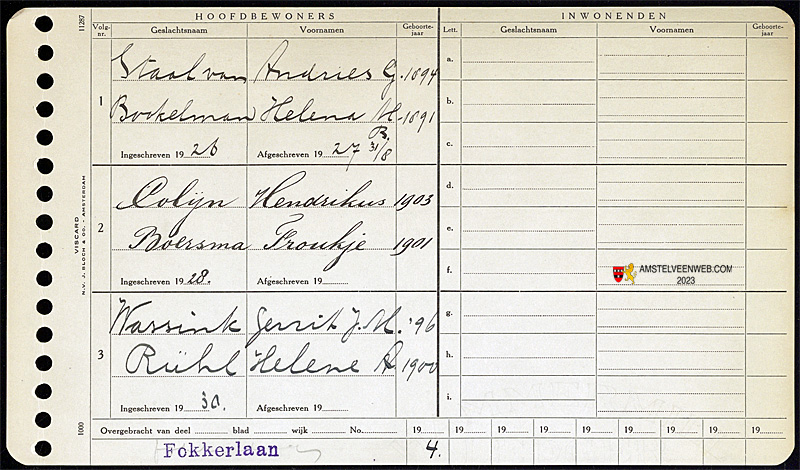 Gegevens uit Adresboek Nieuwer-Amstel van 1926 t/m 1931 over de inschrijving van mensen aan de Fokkerlaan