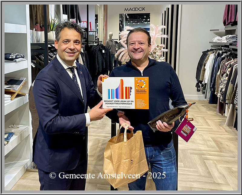 De Dag van de Ondernemer is een jaarlijks moment om ondernemers te waarderen voor hun lef, inzet en bijdrage aan de lokale economie en samenleving. Wethouder ging langs bij voorzitter Koninklijke Horeca Nederland van Amstelland en bestuurslid Amstelveen Culinair Daan Kroone. Daarna werd bestuurslid Vereniging van Centrumondernemers Amstelveen Marco Maddox bedankt voor zijn inzet. Vervolgens werd een bezoek gebracht aan Henk Anrochte van BIZ Rembrandtweg Noord, Jan van Noord van BIZ Amsterdamseweg, voorzitter BIZ Van der Hooplaan Cor Mulder, Erwin en Hilde Buenting van ondernemersvereniging Westijk en voorzitter van Retail Amstelveen en BIZ Kostverlorenhof Atilla Meulenbelt. Willem Ruhe en Ron Hooijman kregen, toekomstig bestuursleden van de BIZ Noorder Legmeerpolder, kreeg ook nog een bos bloemen om te vieren dat de hun bedrijfsinvesteringszone van start kan gaan.