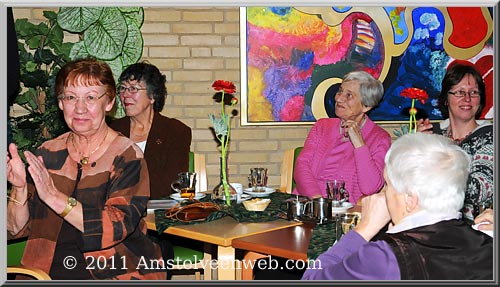 De 100 jarige mevrouw Annigje Koksma volgt nauwlettend alles, wat er in de zaal gebeurt. De redactie van Amstelveenweb feliciteert haar via deze weg met haar verjaardag