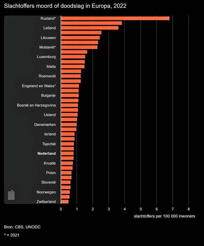 Internationaal gezien weinig moord of doodslag in Nederland. In Europa behoort Nederland tot de landen waar relatief weinig moorden worden gepleegd. In 2022 vielen in Zwitserland, Italië en Noorwegen de minste slachtoffers per 100 duizend inwoners. In landen van de voormalige Sovjet-Unie, zoals Rusland, Oekraïne en Letland, was het aantal slachtoffers in 2022 naar verhouding het hoogst. De cijfers over 2023 zijn nog niet beschikbaar.