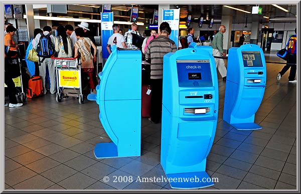 Geautomatiseerde self-service-check-in apparaten op Schiphol. Hier kunnen de passagiers met hun vooraf via internet aangeschafte e-ticket inchecken. Voor vele reizigers is dit een onbegrijpelijke handeling, maar gelukkig worden ze vaak door het aanwezige personeel geholpen.