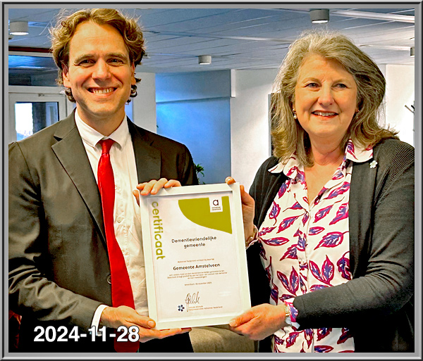 Amstelveen is vanaf nu officieel een dementievriendelijke gemeente. Een bestuurslid van Alzheimer Nederland reikte donderdag 28 november 2024 het certificaat hiervoor uit aan Marijn van Ballegooijen (PvdA) wethouder Zorg en Welzijn. Een dementievriendelijke gemeente zet zich actief in om mensen met beginnende vergeetachtigheid of dementie zo lang mogelijk mee te laten doen in de samenleving.