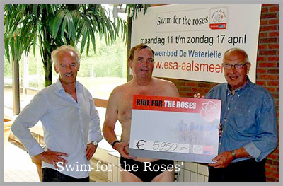 Op dinsdag 26 april 2011 is de cheque met de (voorlopige) opbrengst van de actie ‘Swim for the Roses’ uitgereikt. De deelnemer die de meeste kilometers had gezwommen, dhr. Bertus van Alen reikte de cheque uit aan dhr. Piet Boom, voorzitter organisatie 'Ride for the Roses' in Aalsmeer.