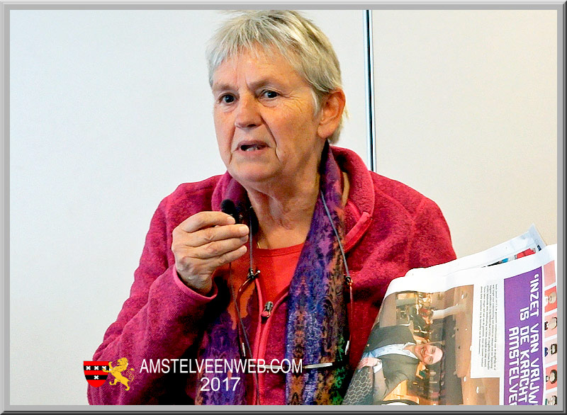 Mevrouw Janet Parlevliet spreekt de mensen toe en nodigt ze uit om een gesprek te voeren over het ouderenbeleid van de gemeente Amstelveen. Zij was tot 2005 fractievoorzitter en later gemeenteraadslid van D66-Amstelveen