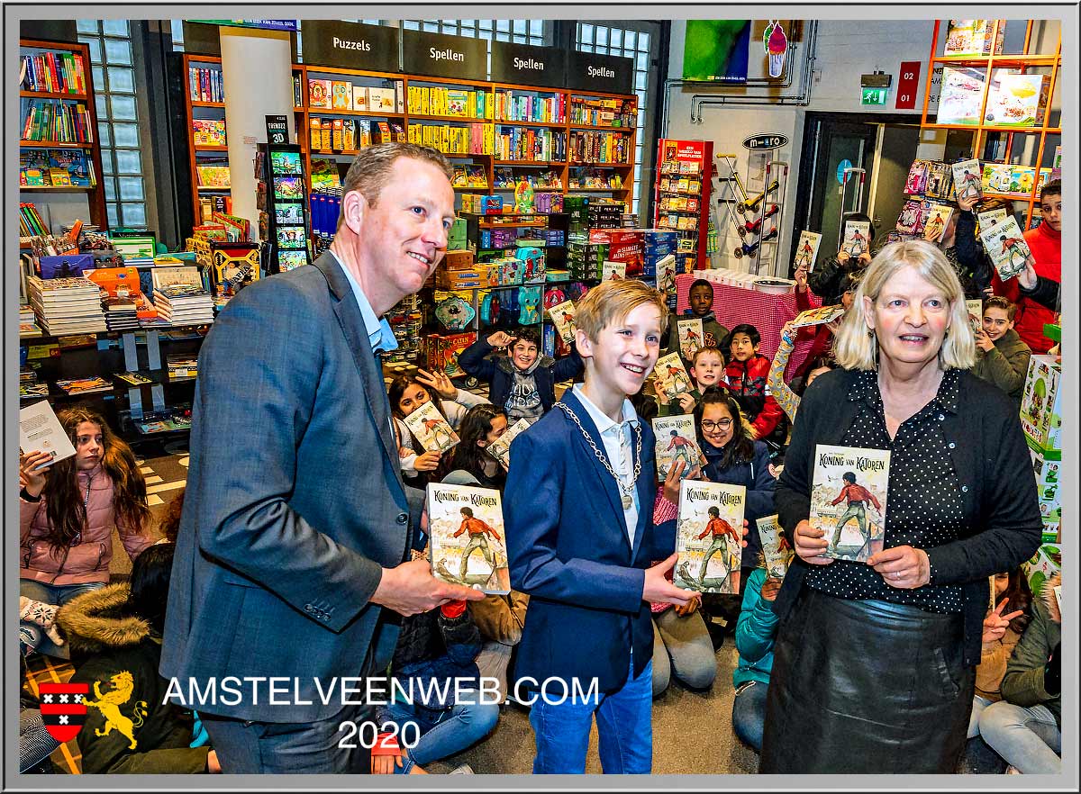Lieuwe, de Kinderburgemeester van Amstelveen deelt de boeken uit aan zijn schoolgenoten