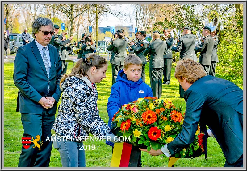 Na het blazen van het Nederlandse taptoe signaal en een minuut stilte, speelde de regimentsfanfare het Nederlandse volkslied, waarbij de halfstok hangende vlaggen van Nederland en Amsterdam, naar de top werden gehesen. Vervolgens begon de traditionele kranslegging en als eerste was dit de heer Bas Eenhoorn, burgemeester van Amstelveen namens de gemeente, waarna de speciale gasten uit Amsterdam, Amerika en Duitsland. Zij werden gevolgd door verschillende kamporganisaties die ook hun kransen in een halve cirkel langs het monument legden, waarbij het regiment bij elke kranslegging een korte hymne speelde. Allen werden ze begeleid door twee leerlingen van groep acht van de Merkelbachschool.