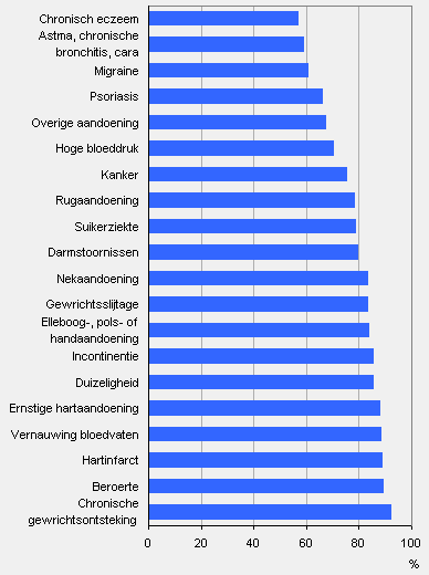 Chronische eczeem, astma en migraine zijn ziektes die naar verhouding meer mensen van jongere of middelbare leeftijd treffen. Deze ziektes komen vaker alleen voor, alhoewel nog steeds meer dan de helft van de mensen met deze ziektes ook een andere langdurige ziekte heeft.