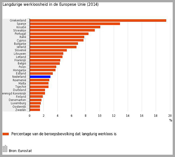 Vergeleken met andere EU-landen is het aandeel langdurig werklozen in de beroepsbevolking in Nederland relatief laag. Vorig jaar was 3,0 procent van de Nederlandse beroepsbevolking langdurig werkloos. Het EU-gemiddelde was 5,1 procent. Griekenland staat eenzaam aan de top met 19,5 procent langdurig werklozen, met een stuk daaronder Spanje: 12,9 procent. Onderaan de lijst met EU-landen Zweden en Oostenrijk met 1,5 procent langdurig werklozen gevolgd door Luxemburg met 1,6 procent.