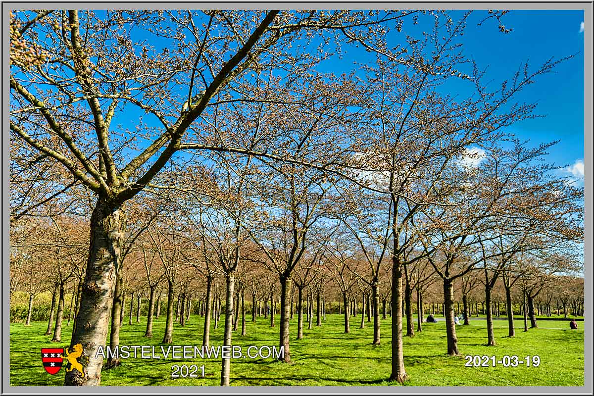 De bloesem van de bomen in het Kersenbloesempark van Amstelveen op 19 maart 2021 beginnen uit te komen, maar een klein beetje warmer weer zou het proces zeker versnellen