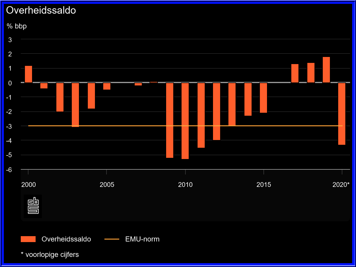 De coronacrisis heeft een enorme bres geslagen in de Nederlandse overheidsfinanciën. Realiseerde de overheid over 2019 nog een overschot van ruim 14 miljard euro, over 2020 kwam de overheid 34 miljard euro tekort. Dit komt overeen met 4,3 procent van het bruto binnenlands product (bbp). De schuld nam in één jaar met 40 miljard euro toe, tot 435 miljard euro, oftewel 54,5 procent van het bbp. Dit meldt het Centraal Bureau voor de Statistiek (CBS) op basis van nieuwe voorlopige cijfers over de overheidsfinanciën.
