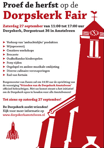 Met uw komst steunt u het initiatief om de Dorpskerk open te houden! Aan jong en oud is gedacht: er is een verkoop van ambachtelijke producten, een wijnproeverij, creatieve workshops, oud Hollandse kinderspelen, pony rijden om de kerk, orgelspel, rad van fortuin etc. Natuurlijk is er die dag ook gelegenheid om Vriend of vriendin van de Dorpskerk te worden.
