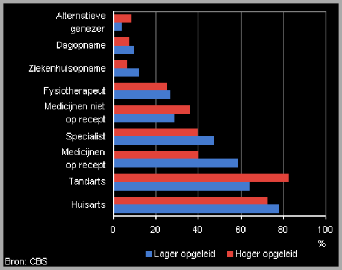 Het gebruik van zorg blijkt samen te hangen met opleidingsniveau. Lager en hoger opgeleiden hebben elk een specifieke zorgconsumptie. Lager opgeleiden gaan meer naar de huisarts en de specialist dan hoger opgeleiden, ze liggen meer in het ziekenhuis en gebruiken vaker voorgeschreven medicijnen. Hoger opgeleiden gaan juist vaker naar de tandarts en de alternatieve genezer en ze gebruiken vaker medicijnen die niet zijn voorgeschreven. Alleen bij de fysiotherapeut is er geen verschil tussen lager en hoger opgeleiden: ruim een kwart van de 25-plussers heeft in één jaar tijd contact met een fysiotherapeut.