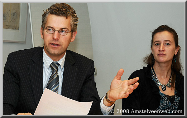 Wethouder Jan-Willem Groot van Economische zaken en Werkgelegenheid en Esther Gorissen beleidsadviseur Sociale Zaken bij de Gemeente Amstelveen tijdens de persbijeenkomst op 20 november 2008