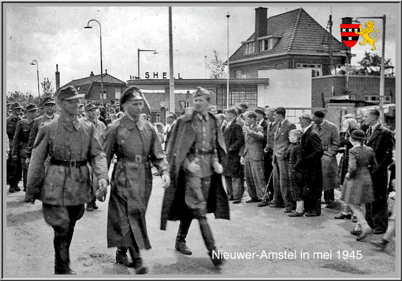 Aftocht van de Duitse troepen in Nieuwer-Amstel in mei 1945 aan de hoek Amsterdamseweg / Burgemeester A. Colijnweg