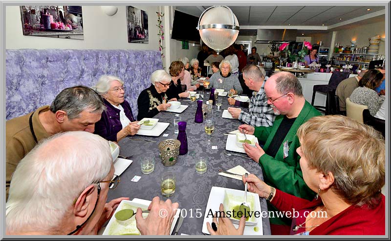 Mijn achtergrond is, dat ik 10 jaar lang het KinderKookKafé heb geleid en dat is, waar het om gaat. Elkaar opzoeken en praten, durven initiatief te nemen en gewoon een beetje voor elkaar zorgen nu en in de toekomst. Heel veel plezier vanavond, leer elkaar te kennen en doorschuiven! Ik ken het doorschuiven, toen ik een restaurant in de Jordaan had, want daar werd het voorgerecht en het hoofdgerecht in verschillende restaurants opgediend en dat wil ik een keer ook in Amstelveen doen!' Hij wenste alle aanwezigen een heel gezellige avond toe en natuurlijk ‘Smakelijk eten!’