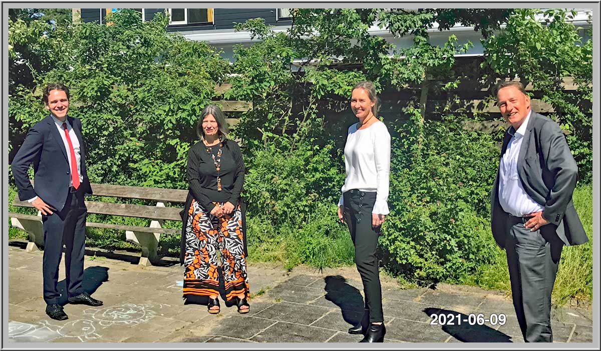 Wethouder Van Ballegooijen, Naomi Tas (bestuurder RIBW K/AM), Bionda Olivier (Villex) en wethouder Ellermeijer voor het gebouw aan de Graaf Janlaan 28 op 9 juni 2021