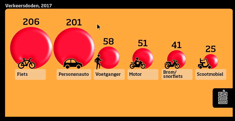 In 2017 kwamen 206 fietsers om in het verkeer, 17 meer dan in 2016 en het hoogste aantal in tien jaar. In 2017 kwamen 201 inzittenden van een personenauto om het leven, 30 minder dan in 2016. Het is voor het eerst dat er meer dodelijke verkeersslachtoffers op de fiets zijn dan in de auto. Verder overleden 58 voetgangers, 51 motorrijders, 41 brom- en snorfietsers en 25 bestuurders van een scootmobiel als gevolg van een verkeersongeluk.