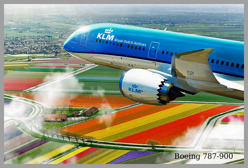 Boeing 787-900 - artist impression vliegend over de bollenvelden
