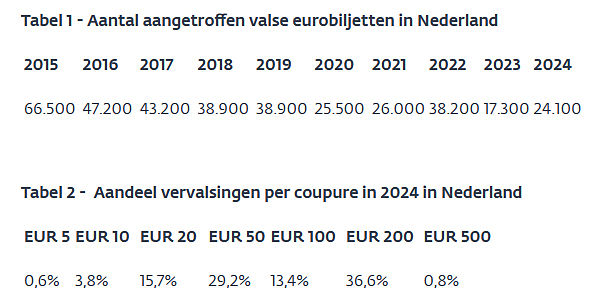 In 2024 zijn in Nederland 24.100 valse eurobiljetten uit circulatie gehaald. Dat is 40% meer dan het historische lage aantal van 2023. Deze toename is vooral het gevolg van een beperkt aantal oplichtingszaken met valse biljetten van lage kwaliteit. Vergeleken met het aantal echte biljetten in omloop is het risico op het aantreffen van een vals biljet nog altijd klein- meldt De Nederlandsche Bank.