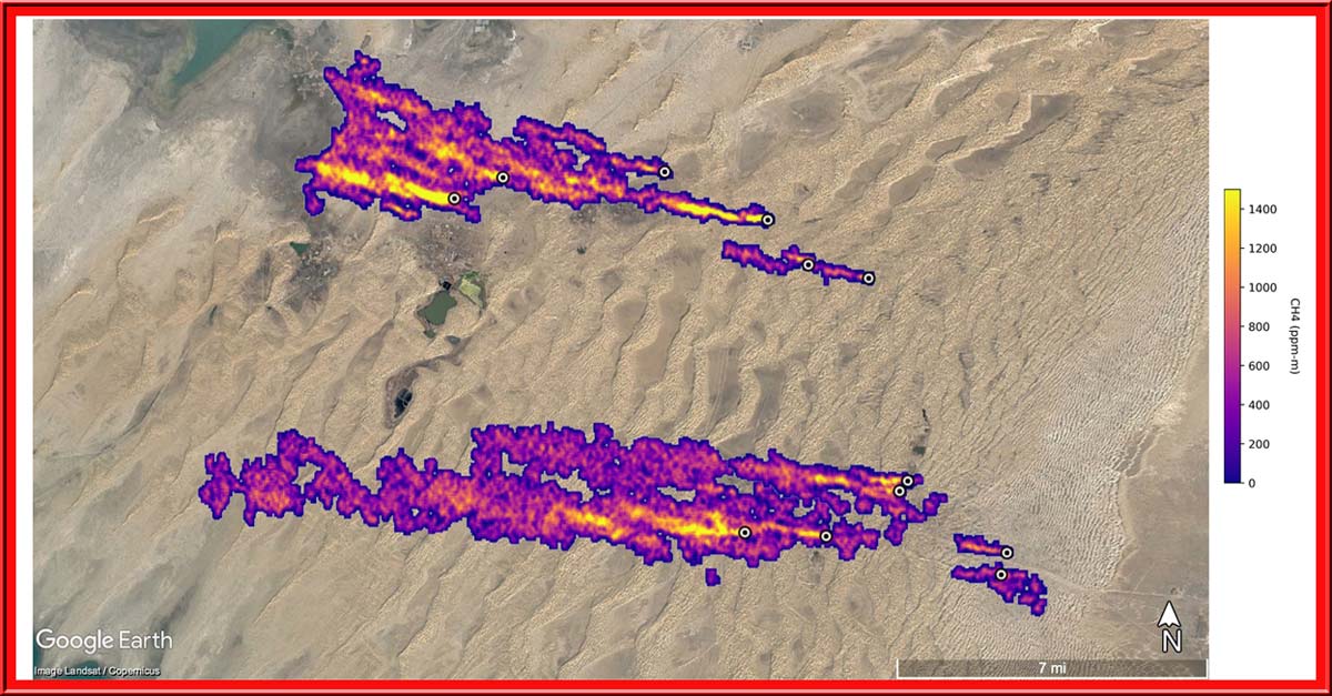 Het instrument detecteerde bijvoorbeeld een pluim van ongeveer 3,3 kilometer lang ten zuidoosten van Carlsbad, New Mexico, in het Perm-bekken. Een van de grootste olievelden ter wereld, het Perm bestrijkt delen van het zuidoosten van New Mexico en het westen van Texas. In Turkmenistan identificeerde EMIT 12 pluimen van olie- en gasinfrastructuur ten oosten van de havenstad Hazar aan de Kaspische Zee. In westelijke richting strekken sommige pluimen zich uit over meer dan 32 kilometer.