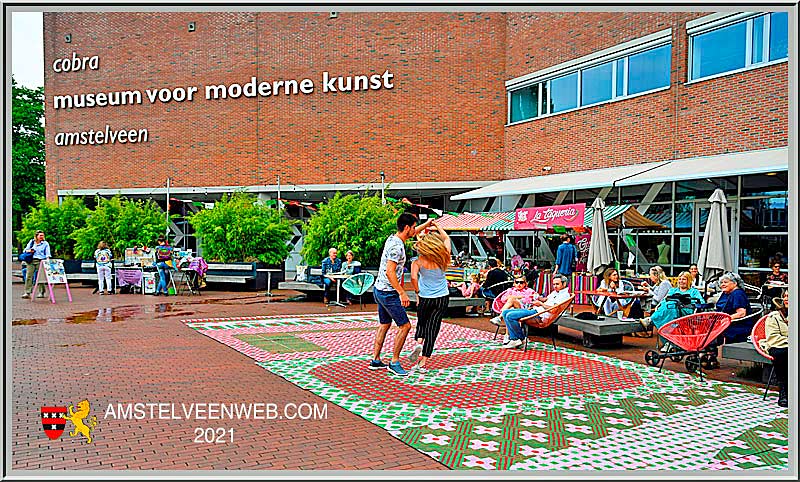 Het terras voor het Cobra Museum verkeerde op zaterdag 26 juni 2021 in Mexicaanse sferen toen de redactie van Amstelveenweb daar een bezoek bracht. Op een foto uit het persbericht stond een groep Mexicaanse dansers in kleurrijke kostuums dus daar rekende de redactie ook op. Helaas kwam die groep niet op de afgesproken tijd. Wel was er een enthousiast koppel, Francella en Diego, dat ook vol vuur danste, echter zonder een vrolijk gekleurde kledij.