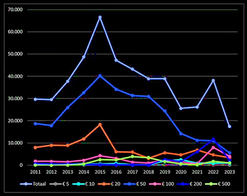 Het 50 eurobiljet is in Nederland nog steeds het meest aangetroffen vervalste biljet, maar het aantal ervan is sinds 2015 gestaag gedaald (zie in de grafiek de oranje lijn). Een aantal mogelijke verklaringen hiervoor is het afnemend gebruik van contant geld, oplettende winkeliers die biljetten controleren op echtheid, en aandacht vanuit politie en justitie bij het bestrijden van deze vorm van criminaliteit. Verder werden in 2023 minder valse eurobiljetten van 100 en 200 uit de circulatie gehaald. De piek in 2022 was vooral het gevolg van een beperkt aantal oplichtingszaken met valse biljetten van zeer lage kwaliteit.