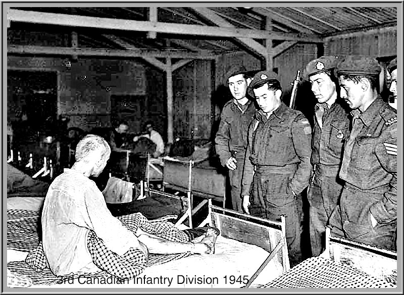 Leden van de Canadese 3de Infanterie Divisie bezoeken een uitgehongerde gevangene, bevrijd uit een nazi concentratiekamp op 24 april 1945
