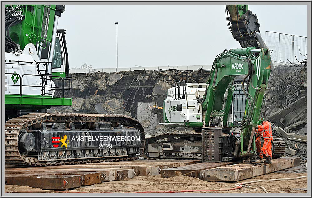 Om het asfalt te beschermen tegen vallende brokken beton, werden rijplaten op het wegdek gelegd en vervolgens ook een laag zand aangebracht. Het beton van het viaduct, behalve de lange liggers, werd stukgeknepen en viel in grote brokken op de grond. Daarna werden de brokken iets kleiner gemaakt om vervoerd te kunnen worden. Om geluidhinder van het slopen te beperken werden de overgebleven brokstukken elders vergruist. Ook werd tijdens het werk met water gespoten om stofvorming tegen te gaan. Dat is allemaal op de volgende foto?s te zien.