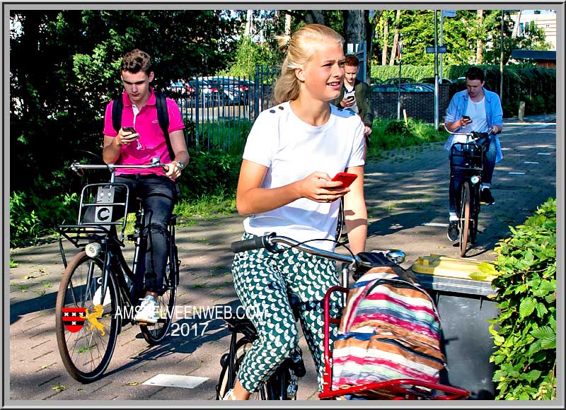 De foto bewijst, dat de leerlingen ervaren smartphone gebruikers zijn tijdens het fietsen