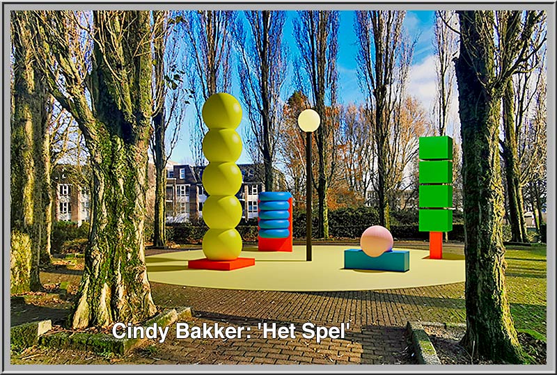 Over de kunstenaar. Cindy Bakker laat zich inspireren door alledaagse kleurrijke objecten en vormen, zoals verkeersborden, oranje pvc-buizen op bouwterreinen of groene prullenbakken. Ze gebruikt deze objecten - vaak sterk uitvergroot - in haar werk en zet ze lukraak neer, alsof kinderen ermee hebben gespeeld. Voor het kunstwerk in Wijkpark Middenhoven heeft Cindy zich laten inspireren door buitenspellen, zoals verstoppertje, boompje wisselen, stoelendans, stoepranden, knikkeren en voetballen.