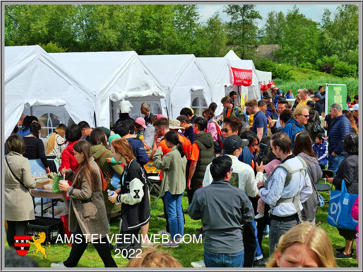 Het weer werkte deels mee, want er was zon, het was droog, maar er was ook veel wind. Rond 11 uur was het al een drukte van jewelste op het grasveld naast de Poel. Er stonden verschillende eetkraampjes met Japanse-, Taiwanese- en Litouwse lekkernijen, waar iedereen met gekochte bonnen naar keuze wat konden kopen. Voor de kraampjes ontstonden al snel lange rijen en voor de meeste Amstelveners waren het onbekende hapjes, maar ze smaakten wel heerlijk. Toen de burgemeester van Amstelveen arriveerde werd hij natuurlijk hartelijk verwelkomd door de leden van de organisatie en kon hij wat rondkijken voor het officiële gedeelte van start ging.