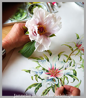 De afbeeldingen zijn te zien op haar website : PIOEN (Paeonia officinalis), IRIS en BLAUWE REGEN (Iris germanica en Wisteria sinensis) en ORCHIDEE (Phaelaenopsis).