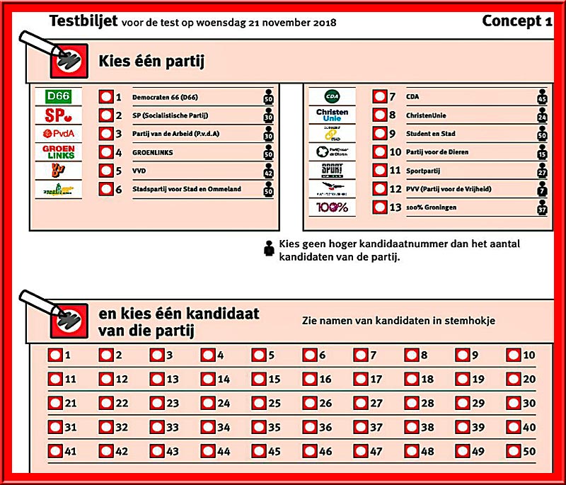 Buitenland als voorbeeld. Om te kijken welk stembiljet voor Nederland geschikt is, heeft het ministerie geïnventariseerd welke stembiljetten in andere landen gebruikt worden. Omdat in ons stelsel het aantal partijen dat kan deelnemen aan de verkiezingen onbeperkt is, het aantal kandidaten per partij maximaal 80 kan bedragen én de kiezer een keuze moet kunnen maken op een kandidaat, zijn er beperkte mogelijkheden om een kleiner stembiljet te realiseren. Het ministerie heeft twee concept stembiljetten laten ontwikkelen die hieraan voldoen.