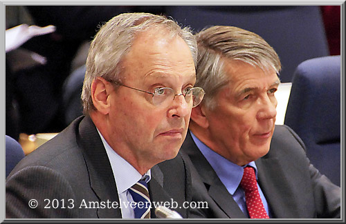 Paul Feenstra (l) en Victor Frequin raadsleden van VVD-Amstelveen tijdens de raadsvergadering op 6 februari 2013