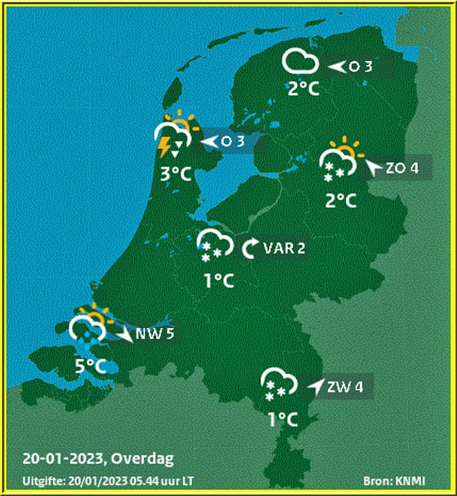 Vanmiddag overheerst de bewolking en vallen er m.u.v. het noordoosten talrijke winterse buien. Op de Veluwe en in het zuidoosten kan het sneeuwdek plaatselijk aangroeien tot 5-8 cm. In de loop van de middag wordt het in de noordelijke helft vrijwel droog. De middagtemperatuur ligt tussen 5°C in het (zuid)westen, elders rond 2°C en in sneeuwval blijft de temperatuur steken rond 0°C. De veranderlijke wind is matig, vlak aan zee vrij krachtig. In de loop van de middag draait de wind van het noorden uit naar noordoost.