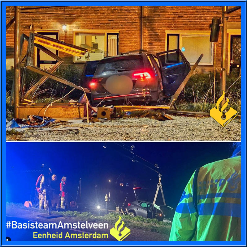 De volgende nacht was het weer raak! Een automobilist en mogelijk 3 vrienden reden over de Amsterdamseweg in zuidelijke richting. Ter hoogte van de St. Annakerk is de bestuurder het fietspad opgereden en uiteindelijk tot stilstand gekomen tegen een woning. Het bushokje wat voor de woning stond in het Oude-Dorp is compleet vernield. De foto zegt genoeg….Alle inzittenden zijn er snel vandoor gegaan. De volgende ochtend een persoon zich gemeld aan het politiebureau. Hij zei dat hij de bestuurder was. Het onderzoek loopt nog. We zijn benieuwd wat we aankomend weekend weer gaan meemaken!