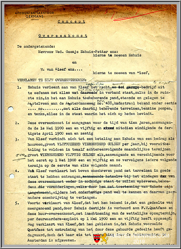 Volgens het contract van 1 mei 1950, opgesteld door accountantskantoor Germans, verhuurde Weduwe Sierhuis het bedrijf aan Opa ‘met alle daarbij behorende terreinen, benzinepompen en tanks, alles in de staat waarin het zich heden bevindt.’ Het contract was vooralsnog voor de eerste tien jaar en kostte per jaar vijfduizend vierhonderd gulden.