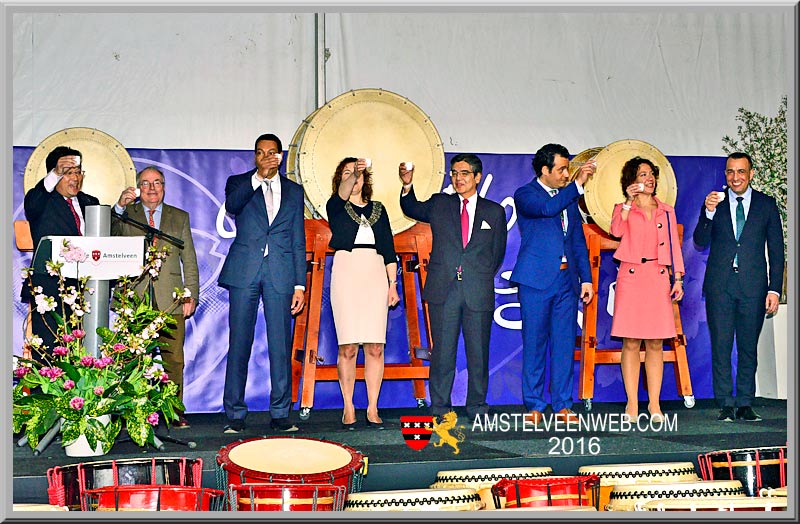 Bij aankomst in de tent die middenin het bloesempark was opgezet, hielden de drummers van de Yamato Taiko School een letterlijk oorverdovende trommelopvoering. Zoals altijd zeer gedisciplineerd, heel hard, maar aldoor met vrolijke gezichten, ondanks het feit, dat dit zeer veel energie kost. Na deze start, verwelkomde mevrouw Christa de Kemp-Everts, directeur van het Amstelveen kantoor bij Amsterdam inbusiness alle gasten en nodigde Mirjam van ’t Veld uit op het podium om haar toespraak te houden. Na haar toespraak kwam Zijne Excellentie de heer Hiroshi Inomata, de ambassadeur van Japan in Nederland naar de microfoon en sprak over de vriendschap tussen Japanners en Nederlanders, met zijn speciale aandacht voor de Amstelveners. Daarna werden alle officials naar het podium uitgenodigd om het traditionele glas sake (rijstwijn) te heffen met het woord kampai, dus proosten!