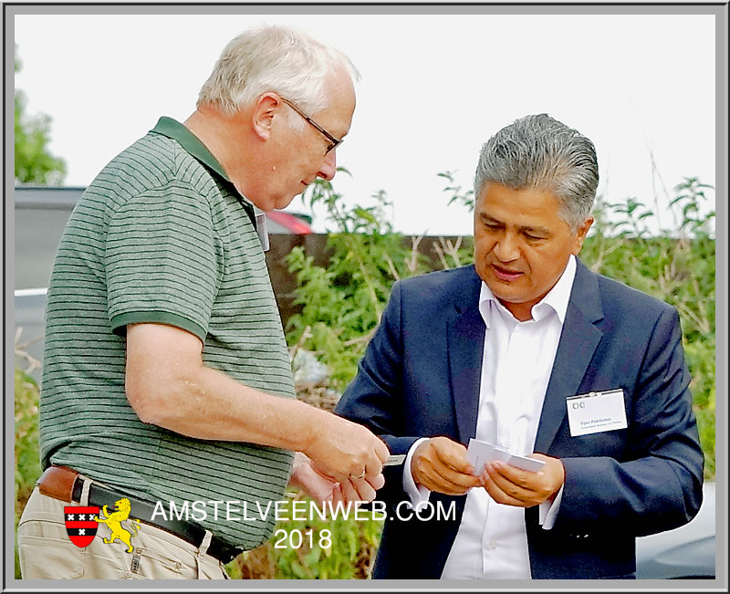 Normaal gesproken is er goed te parkeren bij de Wijnschuur, maar bij een festiviteit wordt het minder eenvoudig, want dan is het in de berm langs de Amstel, dus kwamen ook diverse ondernemers op de fiets. Vanaf 17.30 uur wandelden de ondernemers het terrein op en rond 18.15 uur waren bijna alle leden aanwezig en opende de voorzitter van de Ondernemersvereniging, Alphons Böggemann, de bijeenkomst. Hij heette enkele mensen persoonlijker welkom, de burgemeester was helaas verhinderd, maar hij was zeer vereerd dat alle vijf wethouders Herbert Raat (VVD), Frank Berkhout (D66), Rob Ellemeijer (VVD), Marijn van Ballegooien (PvdA) en Floor Gordon (D66) aanwezig waren. Hij stelde het zeer op prijs dat het college zich betrokken voelt en ook de vele raadsleden en ambtenaren die aanwezig zijn, aangezien zij toch de vertegenwoordigers in de raad van de ondernemingen zijn.