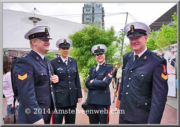 Leden van de Marinierskapel van de Koninklijke Marine kijken nog even rond op het plein