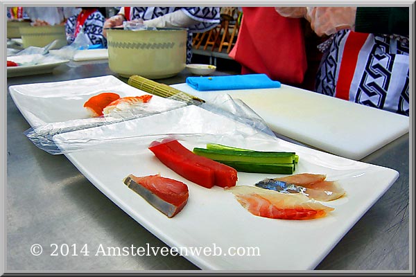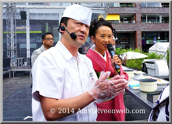 De Masterclass sushi maken werd gegeven door meester Masanori Tomikawa, de Executive Chef, van het Yamazato Restaurant van Hotel Okura Amsterdam. Hij deed dit hoog op het podium. Door de hoogte kon eigenlijk niemand op het Stadsplein zien wat er gebeurde en een video maken was ook niet echt makkelijk. Het was beter geweest als de organisatie een videocamera op de lange tafels had gericht en de beelden op een groot scherm boven het podium zou projecteren. In Amstelveen mocht een aantal uitverkorenen de kunst van meester Masanori Tomikawa afkijken en dat was erg leerzaam, want zelfs de Japanse presentatrice wist niet, dat de sushirol vierkant moet zijn en niet rond.